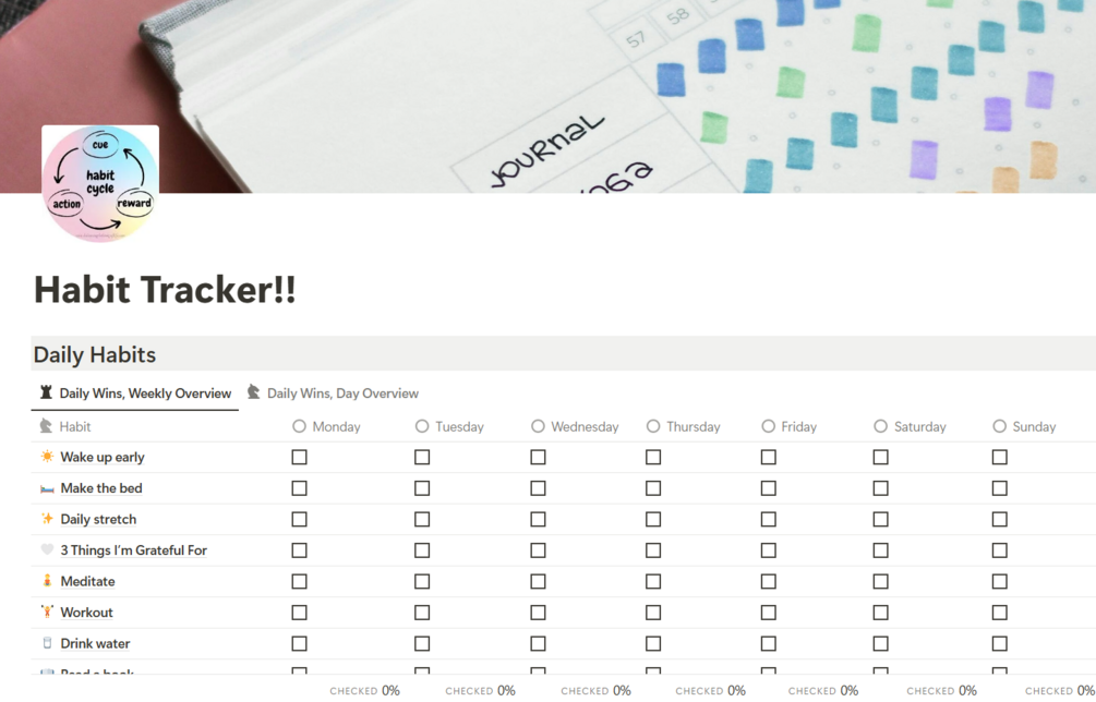 Go Digital with the Customizable Habit Tracker to Track your daily habits in two simple ways, a weekly overview and a daily overview. Tick off your daily goals and keep track of your progress, add mini journal entries to reflect on your goals and achievements, all in one minimalistic template.